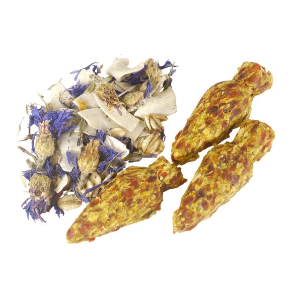 Our special mix of scrummy and nutritious oats, coconut, herbs and cornflowers is great for sprinkling on your pet's food or hay.